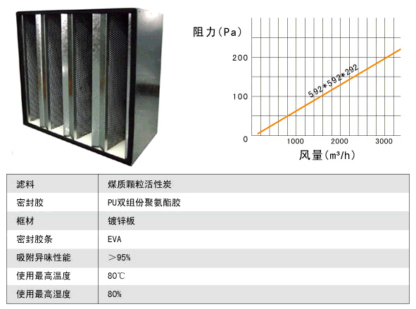 活性炭高效過濾器雙面噴塑護欄支撐;吸附性能強;過濾面積大、含碳量高、使用壽命長。