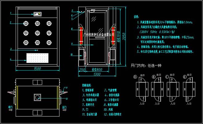 9、進門(由外——內走):打開風淋室進門方向,內門通電互鎖,風淋室照明燈亮,關上外門,系統則語音提示:人或物進入感應區內,當系統檢測到感應區內有人或物時,系統自動進入吹淋程序:內外門自動鎖定,風機啟動開始風淋,系統在預定的時間內開始倒計時,吹淋完畢,系統還原。光電感開關,安裝在風淋室主箱的下方,如需更換必須先拆開回風過濾 器(孔板)方向進行。